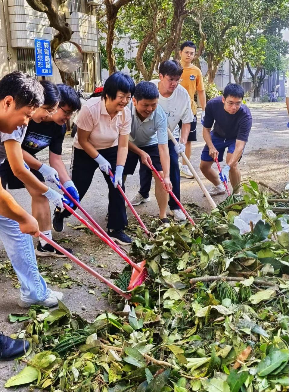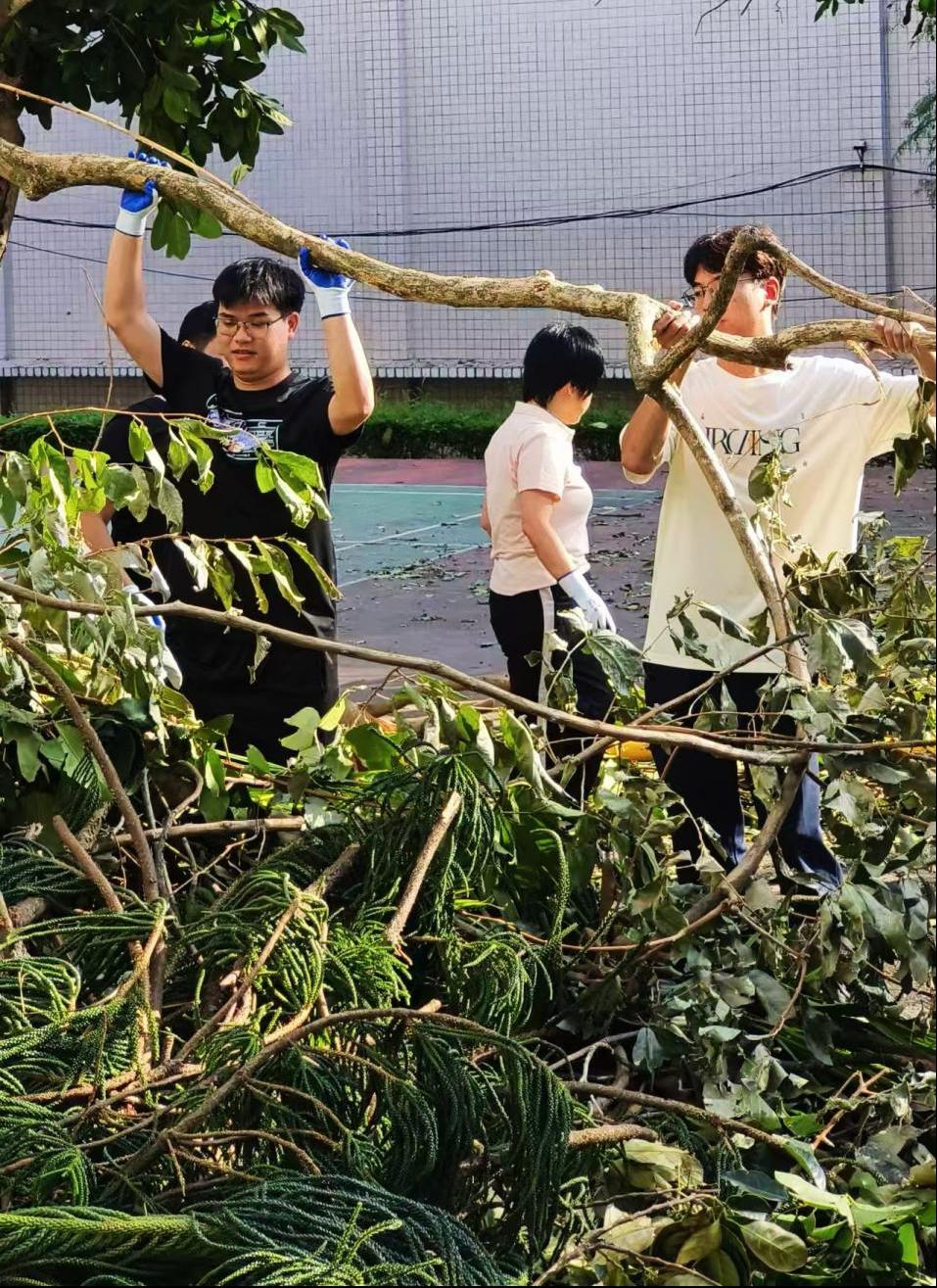 在劳动现场,师生们以高度的责任感和饱满的热情,对实验楼、教学楼、经海楼及学生生活区等重点区域进行了彻底的清理和整治。师生干部挥汗如雨,默契协作,高效地完成了预定区域的清扫任务,使校园环境在短时间内得到了有效恢复。同学们纷纷表示,这不仅是一次有效的灾后环境清理实践,更是一堂生动的劳动教育课和集体主义教育课。