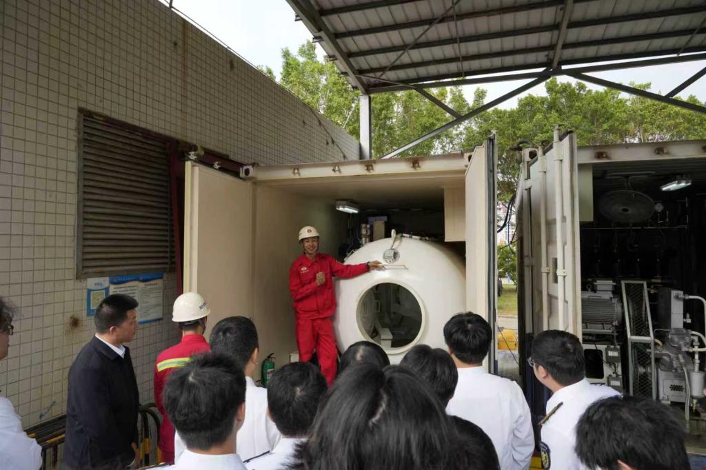 首先,牛念喜等带领师生走进救助设备室与减压舱,细致讲解各类设备的功能原理、操作流程及实战应用场景。从应急救援装备的精准调试,到减压舱保障潜水员安全的核心机制,校友的生动讲解与实物观摩相结合,让同学们跳出课本理论,直观感受海上救助工作的专业性与严谨性。